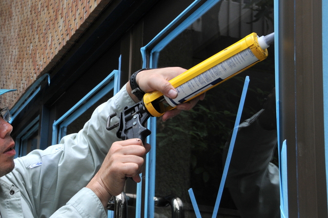 バックセットと言われるスポンジをサッシとガラスの間につめ込み、仮で固定します。コーキングを充填するとサッシやガラスに付着しますので、マスキングテープでガラス面とサッシ部分を養生、コーキングを充填し”ヘラ”でコーキングを切ります。最後にマスキングテープを剥がせば綺麗に完成です。