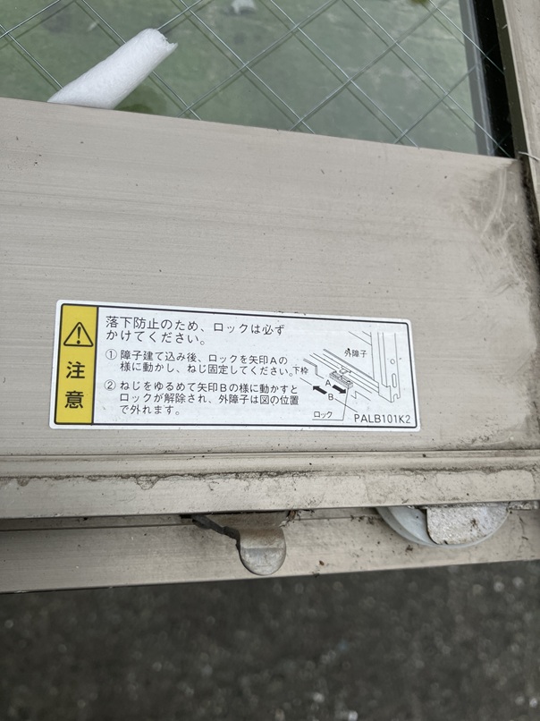 ちなみに、この現場は新しめのマンションということもあり、サッシの外れ止めについても親切な印象です。私が十数年前に遭遇した学校厨房の窓は、この様な説明書きもなく、そもそも外れ止めがサッシ(障子)で見えない構造でした。感を働かせて「外れ止めと切り欠け」を合わせてサッシを外したのを思い出します。