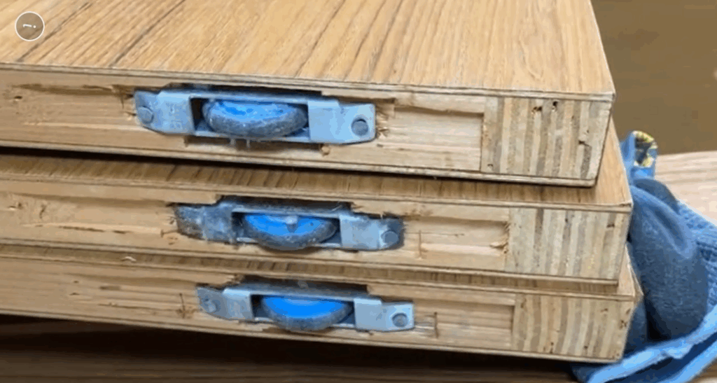 今回の工事は、室内引戸(3枚建)の戸車交換です。築年数の経過した住宅やマンションでは、当時の部品がすでに廃番となっているケースも多く、既存の戸車と同じサイズを入手するのは難しい場合があります。そのため、今回は既存よりも一回り大きなサイズの戸車を準備し、扉側の穴を加工して対応しました。