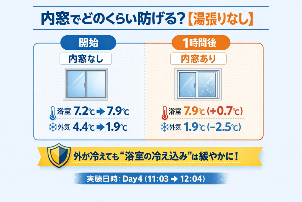 - 内窓は「浴室が冷えにくい(守る)」方向に働く(湯張りなしでも傾向が出た)