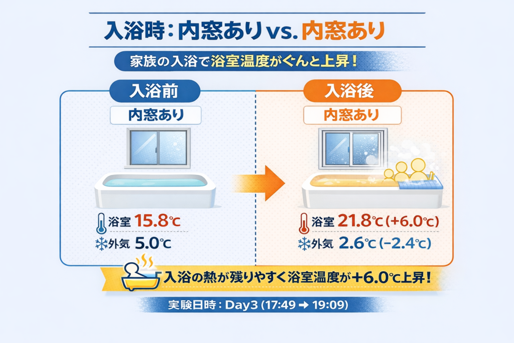 - 湯張り・入浴などの“熱源”があると、内窓を閉めた条件で浴室温度の上昇が大きく出やすい