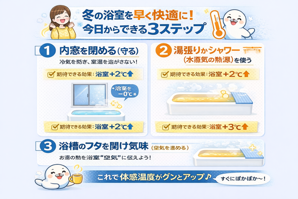 - 内窓は「浴室が冷えにくい(守る)」方向に働く(湯張りなしでも傾向が出た)